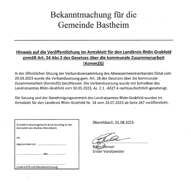 Bekanntmachung für die Gemeinde Bastheim